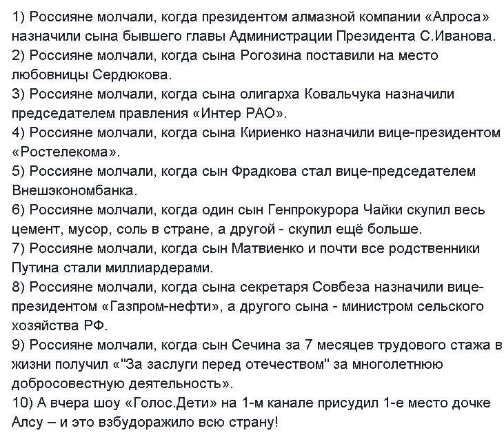 Конечно, все хотели, чтобы такой пример оказался неудачным. В том числе и я. И мы видели в нем угрозу для своей страны. Я помню, как корил их, почему нельзя было всё это решить на выборах? И Путин задавал тот же самый вопрос. И вот прошло 5 лет и они делают все именно так, как мы тогда говорили. Более того, так, как мы еще сами не умеем. Не во власти, а в обществе появился кандидат, которого на цивилизованных выборах поддержала вся страна. Это бесподобно! Всё! Главного повода для неприязни к Украине у нас не стало. Пример на этот раз самый что ни на есть правильный. Я бы сказал спасительный. России 1000 лет, а механизм передачи власти так и не выработан. Царя-то мы свергли, советская модель развалилась, а взамен ничего пока нет. Мы избрали путь демократии (смотрите Конституцию), т.к. все остальные пути заведомо тупиковые, но демократических институтов не создали. На своем пути мы уперлись в бетонную стену, на которой мелом написано: "Кто если не Путин?" Украинские выборы, на которых победил Обычный Человек, показывают, что эта стена всего лишь оптическая иллюзия. Ребята, это же потрясающая новость! |
